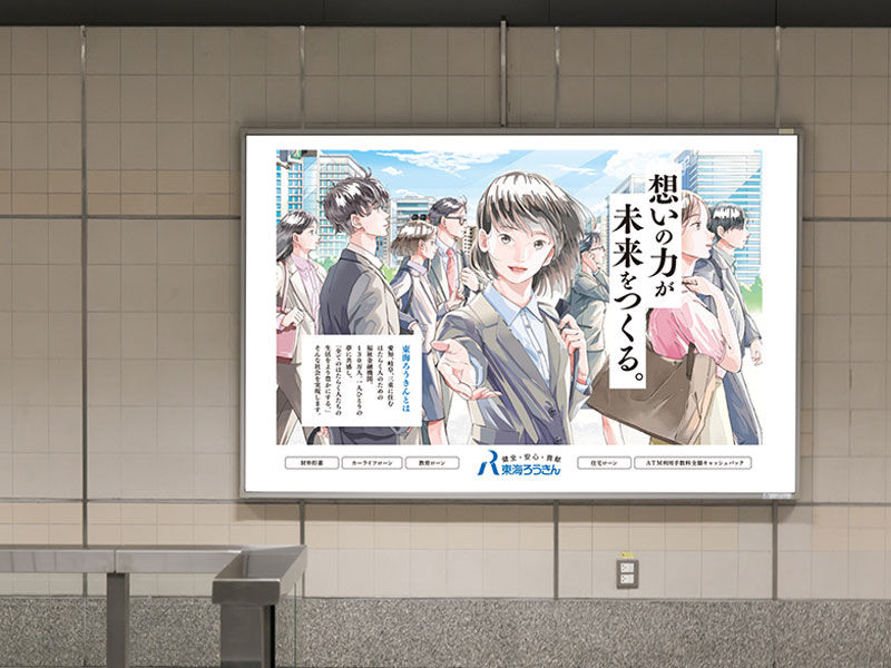 東海ろうきん様の交通広告ビジュアルを制作しました。大学生や若い社会人など、次の時代を担う世代が多く利用する駅に掲出されるため、「地域の金融機関らしい信頼感」と「若い世代に伝わる親しみやすさ」 の両立が求められる案件でした。広告コピー「想いの力が未来をつくる。」に込められたメッセージを受け、若者が未来へ向かって歩み出す姿をアニメテイストで描きながら、地域金融機関としての誠実さを損なわない色調・空気感に調整。駅を行き交う人たちが視線を止めやすい構図と、一人ひとりの表情に“前向きさ”が感じられるよう丁寧に制作しました。